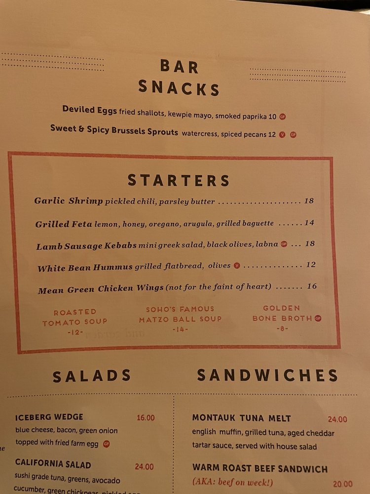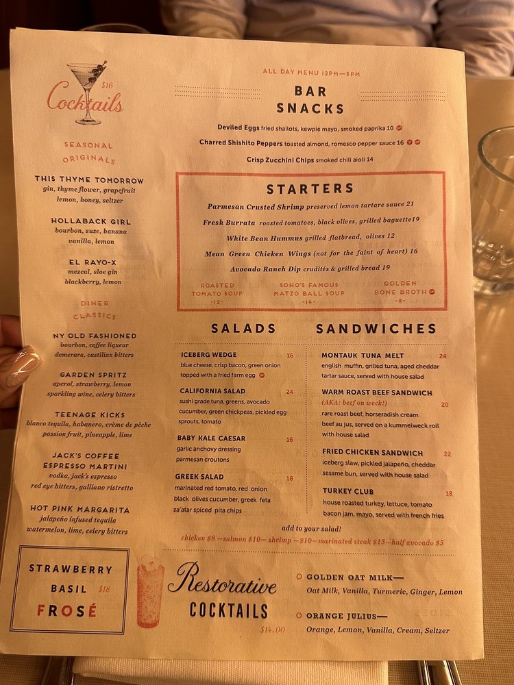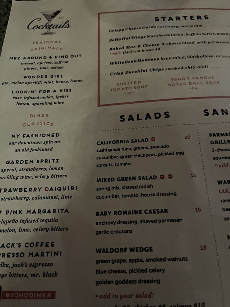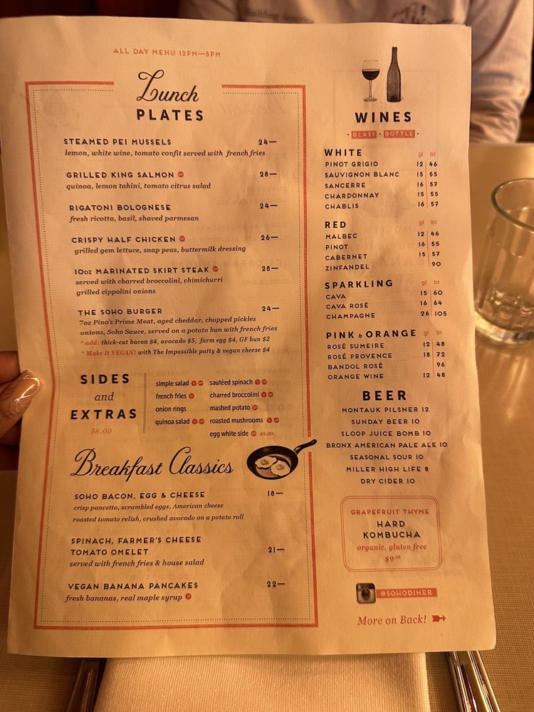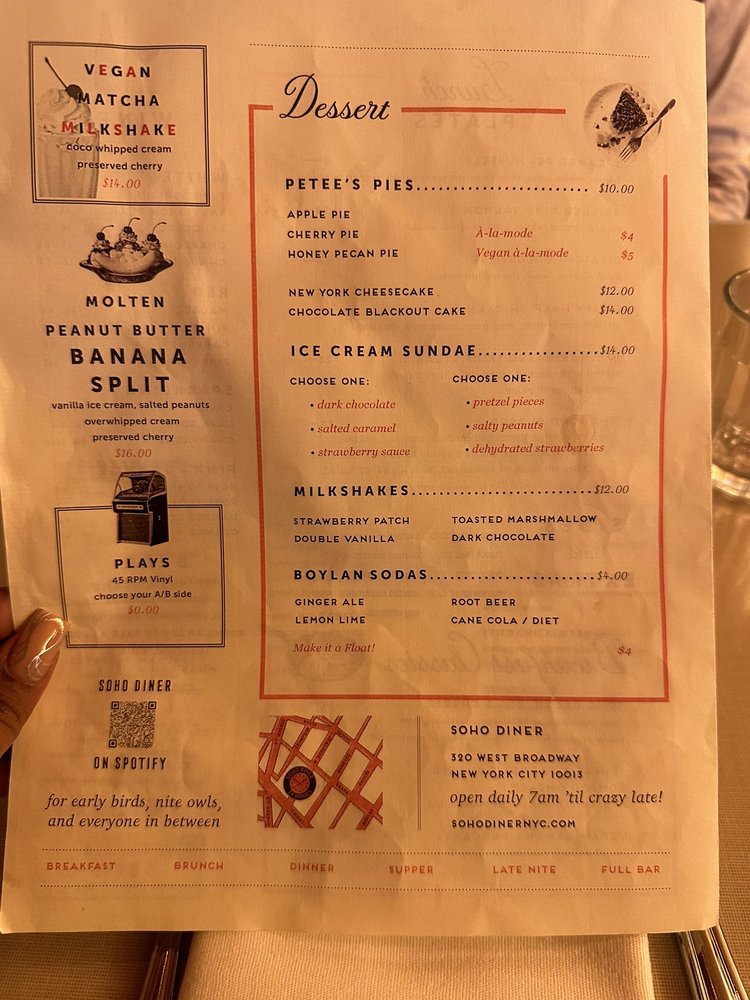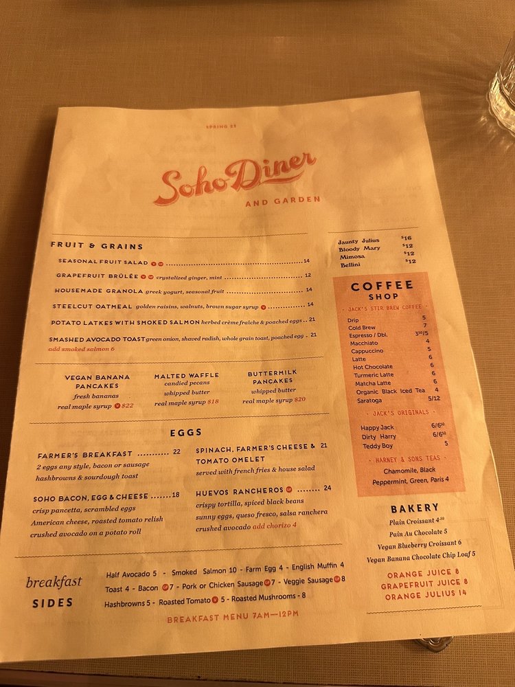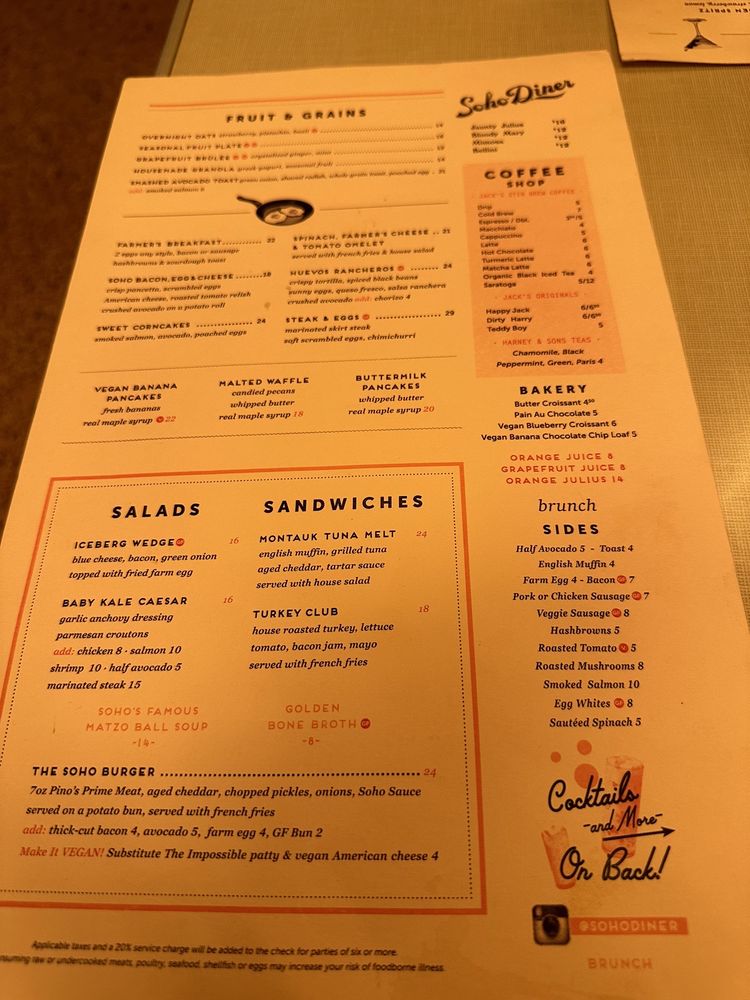 Located in the heart of New York City, Soho Diner offers a unique dining experience blending classic diner vibes with a trendy, hipster atmosphere. The menu caters to a variety of dietary preferences, including vegan and vegetarian options. From seasonal fruit plates to hearty breakfast classics like potato latkes with smoked salmon and avocado toast, Soho Diner has something for everyone. The griddle section features indulgent treats like vegan banana pancakes and malted waffles, while the egg dishes, such as the Farmer's Breakfast and Soho Bacon Egg & Cheese, showcase delicious flavor combinations. Customers rave about the friendly staff, cozy ambiance, and overall great energy of the diner. Whether you're grabbing a quick bite or enjoying a leisurely meal, Soho Diner is a must-visit spot for delicious food and good vibes.